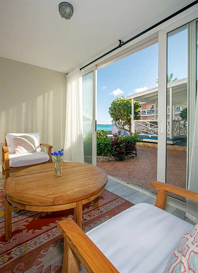 This unit has a partial harbor view with one king bed and kitchenette. It also includes a private balcony, air conditioning, a ceiling fan, a mini-fridge, a hair dryer, private bathroom and satellite TV.